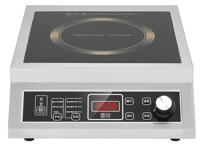 台式商用电磁炉功率是有3500W和5000W,它有1个灶头,功能比较多有爆炒、蒸煮、煮粥、煲汤、火锅、烧水、煎炸、定时等。其使用的也是黑色微晶面板,操作方式是按键式,,火力档位是8档。此款商用电磁炉价格根据公路及套餐的不同也有所不同,大概在500-600左右。