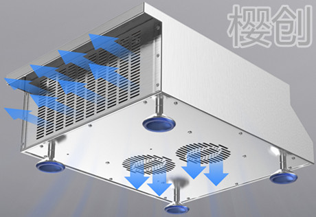 讲到它的背面就不的不说它的散热的成效。 后部强力排风散热,为了避免用户安装时过于放置太靠墙体,所以顶部特意加个钢板,侧面并贴有高温提示避免用户触摸被烫到。 另外底部还安装有2个大大的风扇更助于提高散热的效果。