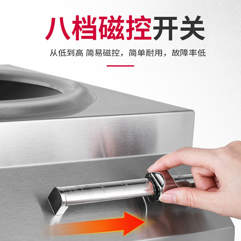 1.第一步我们要科学合理的在使用商用电磁炉的火力档位调控的功能,火力档位调控功率较大的时加温速率会快,同时耗电率也会上升。商用电磁炉在使用中对锅具加温时候需要先在使用中高档位来进行加温,这样一来加温速率快,等蒸发时无特殊要求就尽快把火力档位调控为小瓦数,只需确保蒸发就可以。因常期在使用中高档位不仅耗费电,也会使锅内汤类猛烈蒸发,带来非必要的耗费也会避免浪费锅的使用年限。
